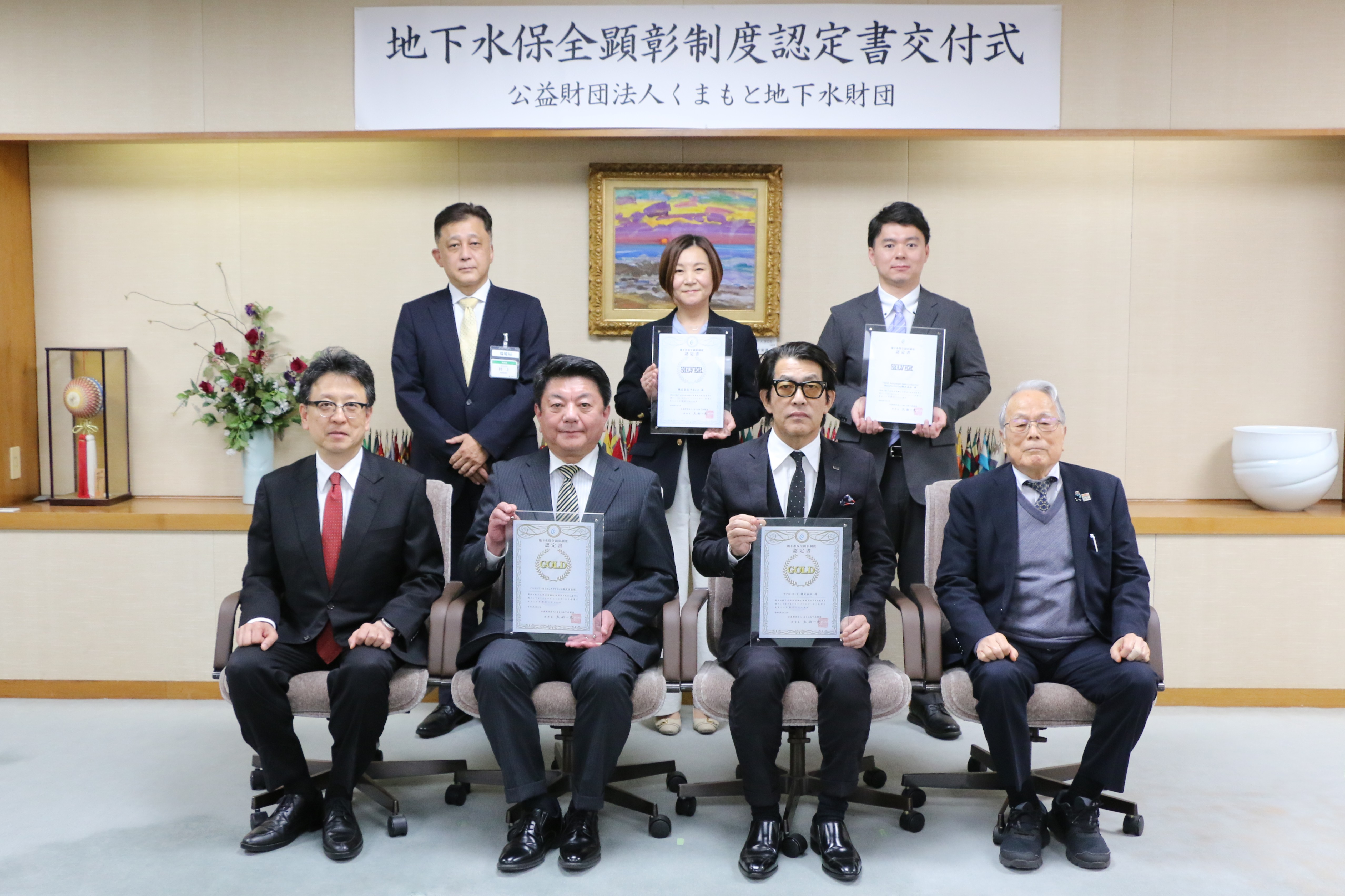 地下水保全顕彰制度にご応募いただき選定された4企業が出席し、大西一史理事長(熊本市長)より各社に認定書を交付いたしました。