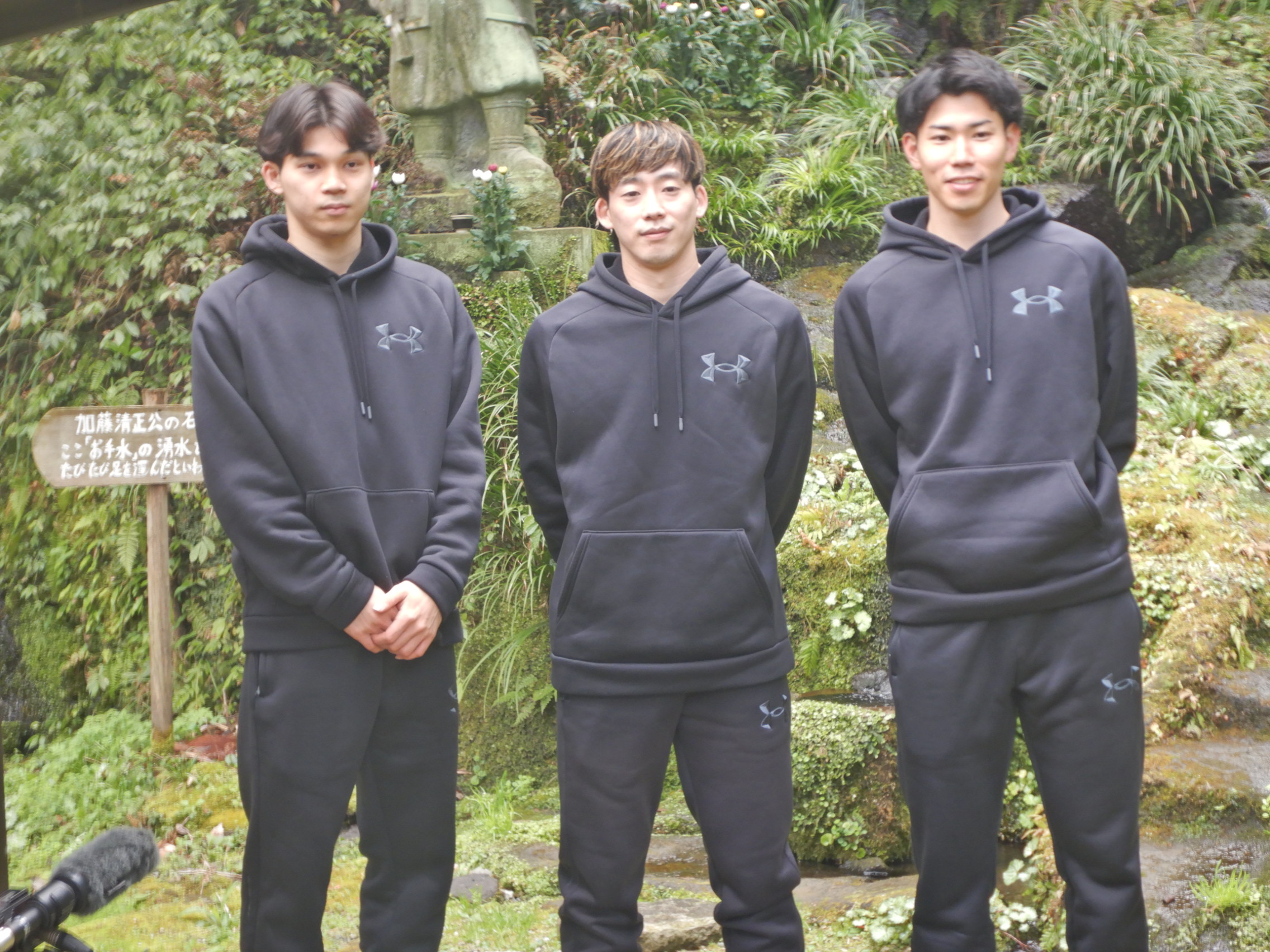 また、水フェスに先立ち、熊本ヴォルターズの磯野選手、保坂選手、長島選手が熊本の水の素晴らしさや、未来へつなぐことの大切さについて学ぶために、お手水の森を訪れました。財団が案内役として熊本の地下水や湧水のお話をさせていただきました。