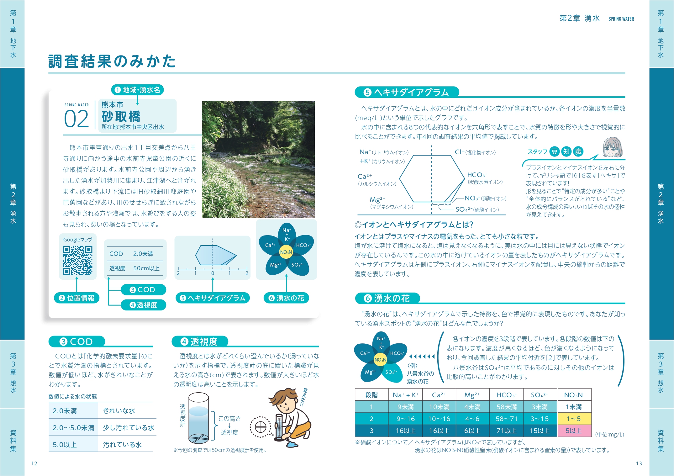デジタルブックには、各地点の透明度やCODを測定し、水に含まれる成分のバランスを図(ヘキサダイヤグラム)で示しています。また、成分量の違いを花びらの色の濃淡で表現した「湧水の花」を地点ごとに作成し、湧水ごとの特徴や違いがひと目でわかるように工夫しています。