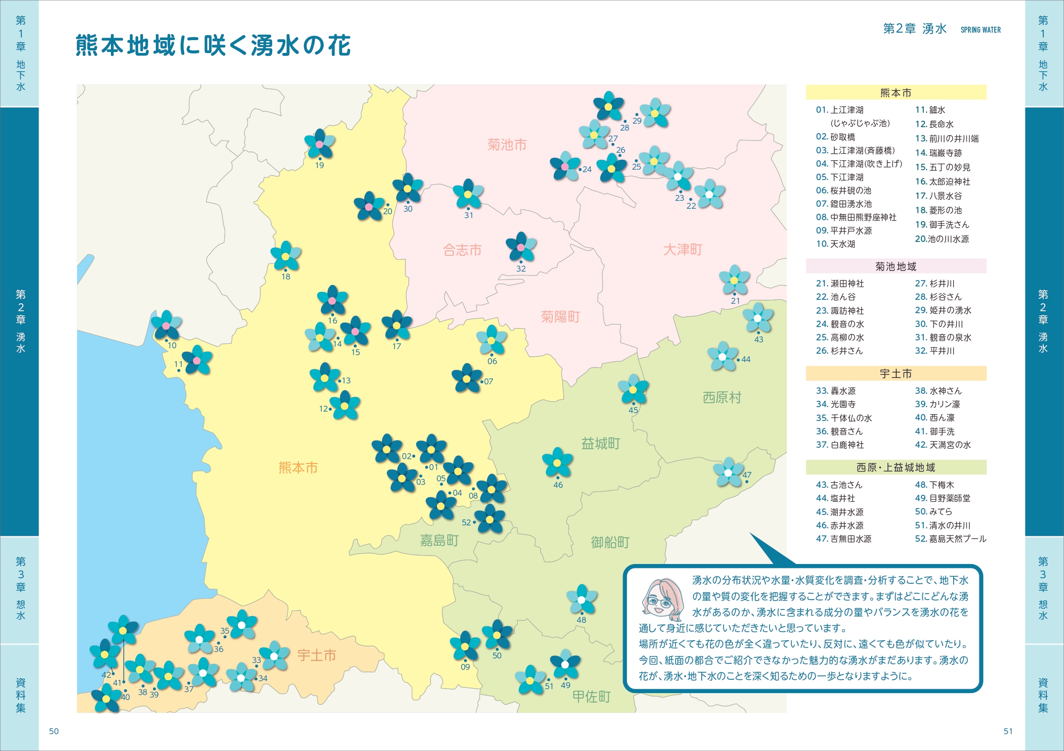 令和2年度から令和6年度までの5年間、熊本地域内の湧水地点52か所の水質調査を実施しました。その調査結果をまとめたデジタルブック「湧水の花」を作成しました。