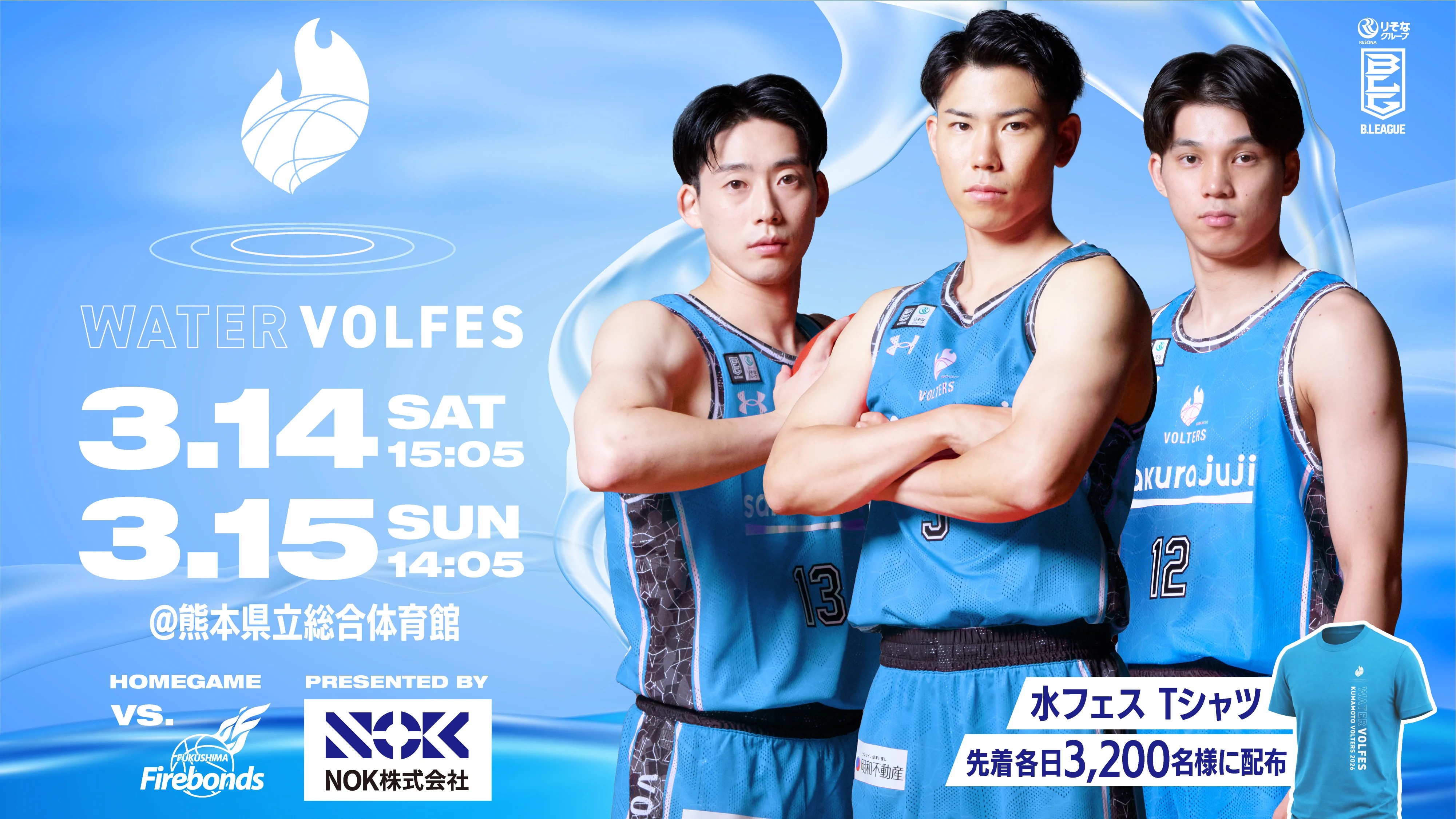 熊本ヴォルターズは、昨年に続き、熊本の貴重な資源である「地下水」の大切さを伝え、保全への意識を高めるため、3月14日(土)・15日(日)のホームゲーム( vs福島ファイヤーボンズ戦)を「水フェス」と題して開催します。