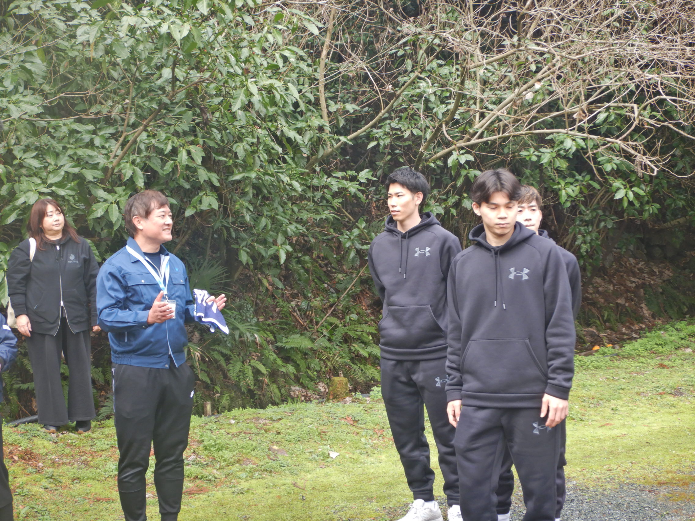 また、水フェスに先立ち、熊本ヴォルターズの磯野選手、保坂選手、長島選手が熊本の水の素晴らしさや、未来へつなぐことの大切さについて学ぶために、お手水の森を訪れました。財団が案内役として熊本の地下水や湧水のお話をさせていただきました。