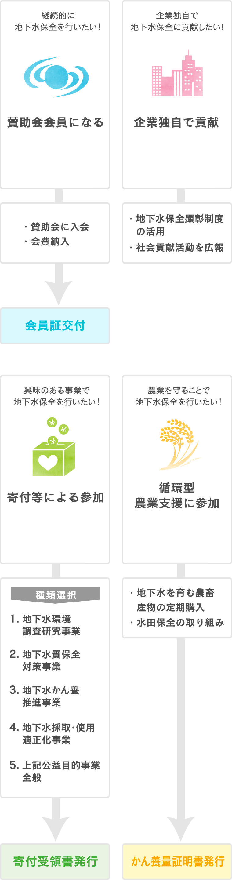 個人の方や企業の方が地下水を守るために取り組むメニューを準備しています。
